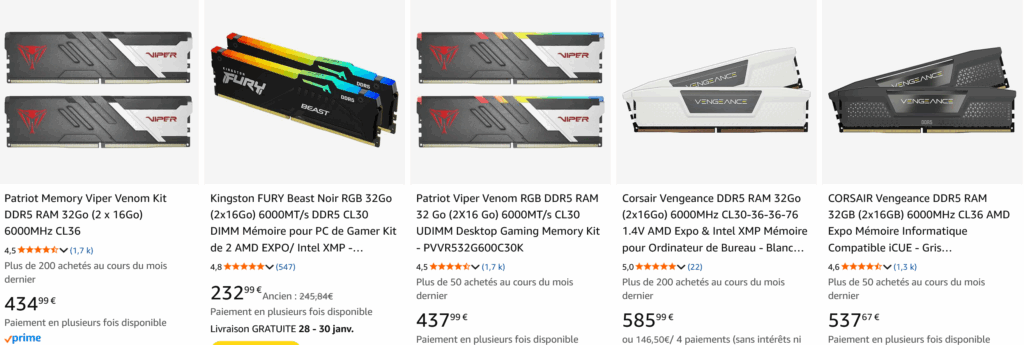 Quoi qu’il en soit, il est bon de rappeler que vous pouvez encore obtenir de très bonne perf avec des PC plus anciens équipés de DDR4 et même de DDR3. Plutôt que de dépenser votre budget dans de la DDR5, pimper un ancien PC avec bonne carte graphique un bon SSD et 32 voire 64 Go de RAM en DDR4/3 est ce qu’il y a de plus malin en ces temps d’arnaques.